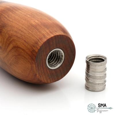 De nombreux kits de projets utilisent un goujon fileté de 9.52 mm (3/8") 16 UNC (1.5875 mm) TPI permettant le démontage pour le nettoyage ou la finition selon les besoins. Cet insert fileté élimine le perçage et le taraudage du manche en bois, ainsi que le risque de rupture du filetage du manche. Depuis 2007, SMA DIFFUSION est une structure entièrement vouée au monde des tourneurs sur bois et à la vente de kits et mécanismes originaux de qualité.