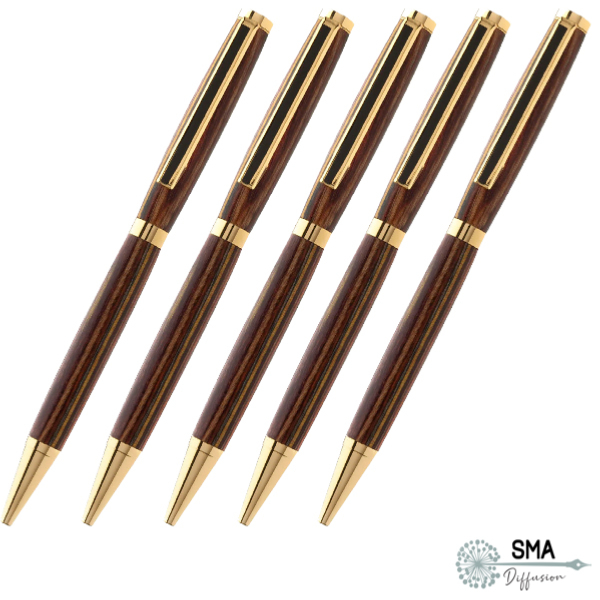 1. Plaqué or 24 k (**) ou Chrome (***) Lot de 5  stylos Bille en 7mm, simples et élégants. Sur la barrette, une ligne noire centrale avec un liseré (doré ou chromé) extérieur. Fourni avec cartouche style "cross" noire, perçage de Ø 7 mm. Existe aussi en version Porte Mine
